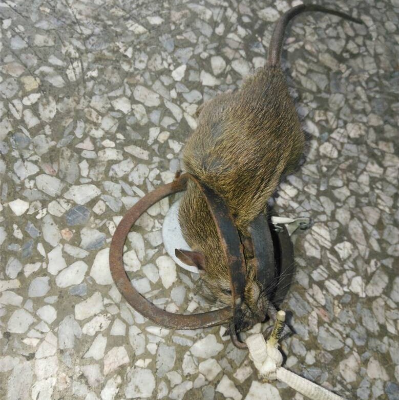 (3)放夾時(shí)要注意自身安全,壓簧桿掛上之后,手始終不要接觸前端(夾老鼠的那端)。鼠夾放好后不得有人在現(xiàn)場走動(dòng),鼠夾要晚放晨收,專人負(fù)責(zé)。在可能情況下,捕到老鼠后馬上重新放置。收夾時(shí)最好拿根棍子敲擊未捕到鼠、上弦待發(fā)的夾子,使壓簧桿復(fù)位后再用手撿。