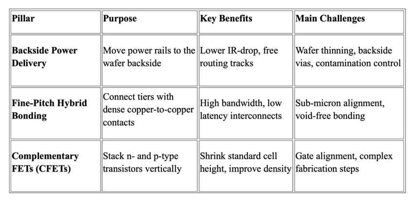 雖然堆疊晶圓的想法聽起來很簡單,但 CMOS 2.0 背后的四大技術支柱,每一項都與傳統半導體制造工藝有著顯著的不同。這些支柱共同定義了該方法的技術基礎,并凸顯了其前景廣闊卻又難以大規(guī)模實施的原因。
