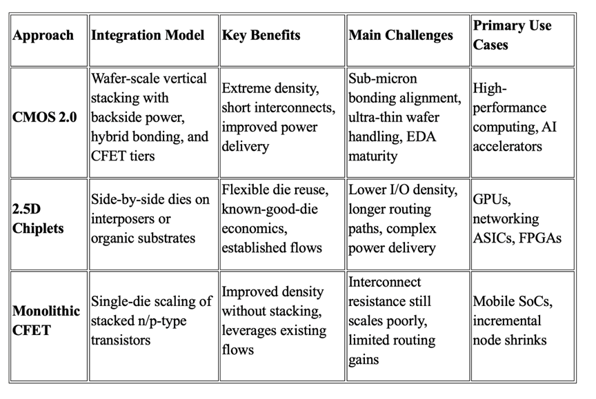 CMOS 2.0 并非擴大規(guī)模的唯一策略。代工廠和系統公司也在大力投資其他替代方案,每種方案都有各自的優(yōu)勢和利弊。